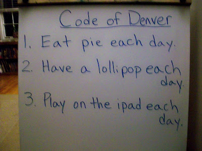 Nevertheless, by mid-morning everyone was dressed, fed, had teeth brushed, and we were all ready for school. For the most part, it went really well! To my surprise, Denver leaped right in-- doing his math with delight, reading to me happily, writing (with some small protest), and reviewing his Latin. He was very interested in physics. How could it be that a heavy object does not fall faster than a lighter object? Why does a potato dropped from a given height sink more deeply into a skewer if you hold it higher?